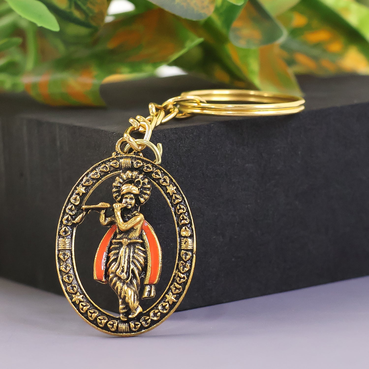 This beautifully crafted keychain features a traditional depiction of Lord Krishna enclosed within an ornate oval frame, creating a divine and elegant accessory suitable for everyday use. Designed with an antique-finish aesthetic, it brings a touch of spirituality and heritage to your keys, bag, or vehicle. The detailed engraving and smooth edges ensure it feels premium and comfortable to carry. Whether used personally or offered as a thoughtful gift, this keychain adds charm, positivity, and cultural value to daily essentials. Its lightweight build makes it easy to attach and durable enough for long-term use. Perfect for anyone who appreciates devotional art and handcrafted detailing.