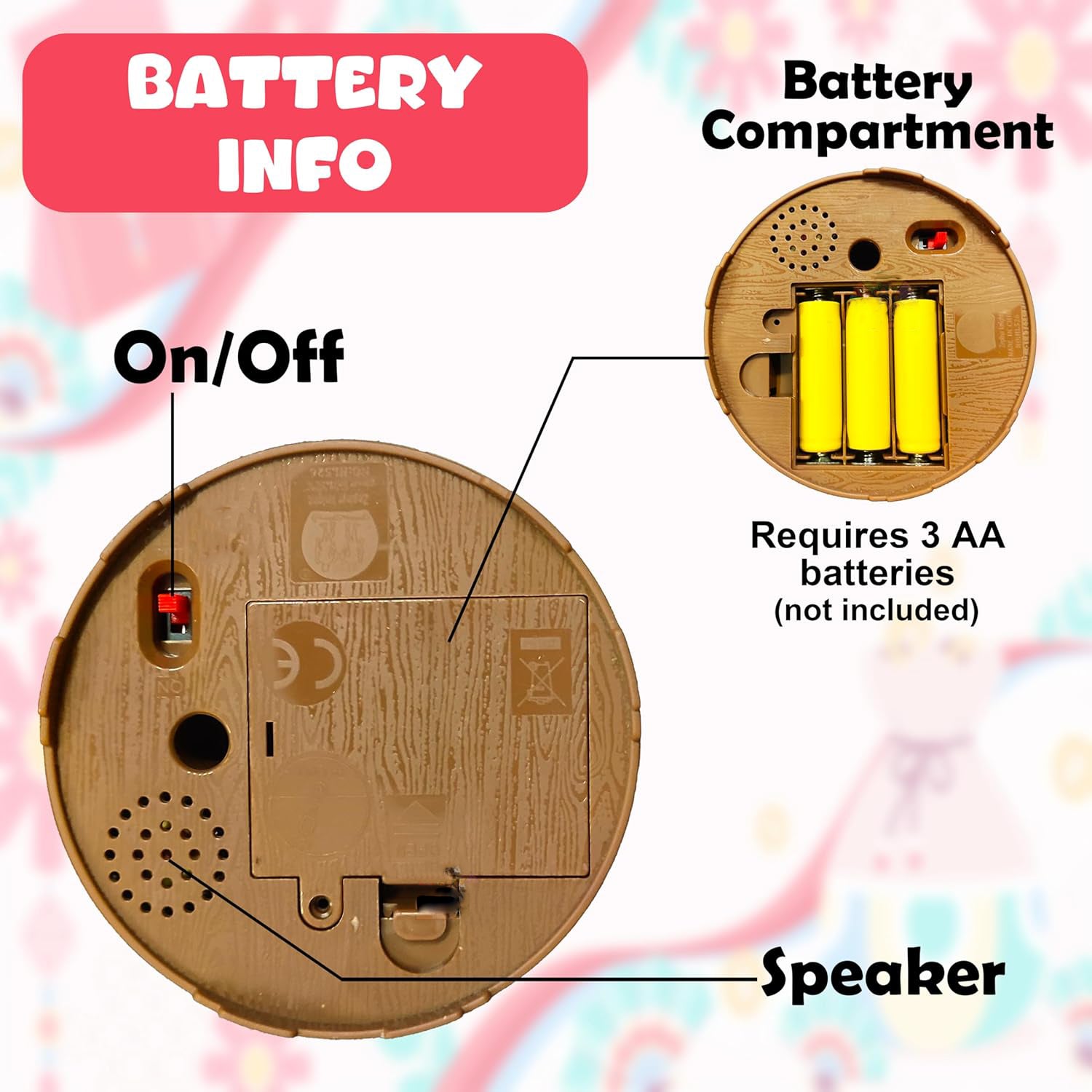 - 【POWER SUPPLY】:- Requires 3 x 'AA' size 1.5V batteries (NOT included). The on/off button is located beneath the toy.